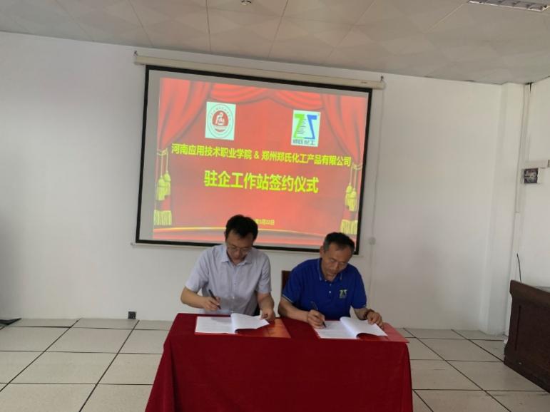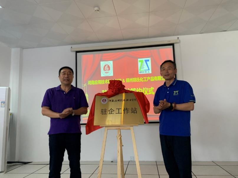 5月22日,星空XK体育官方网站“驻企工作站”在郑州郑氏化工产品有限公司(鹤壁基地)正式挂牌成立。朱冰与郑州郑氏化工产品有限公司(鹤壁基地)郑先祥总经理分别代表校企签订了合作框架协议书,并由蔡庄红代表学校与企业共同为“驻企工作站”揭牌。
