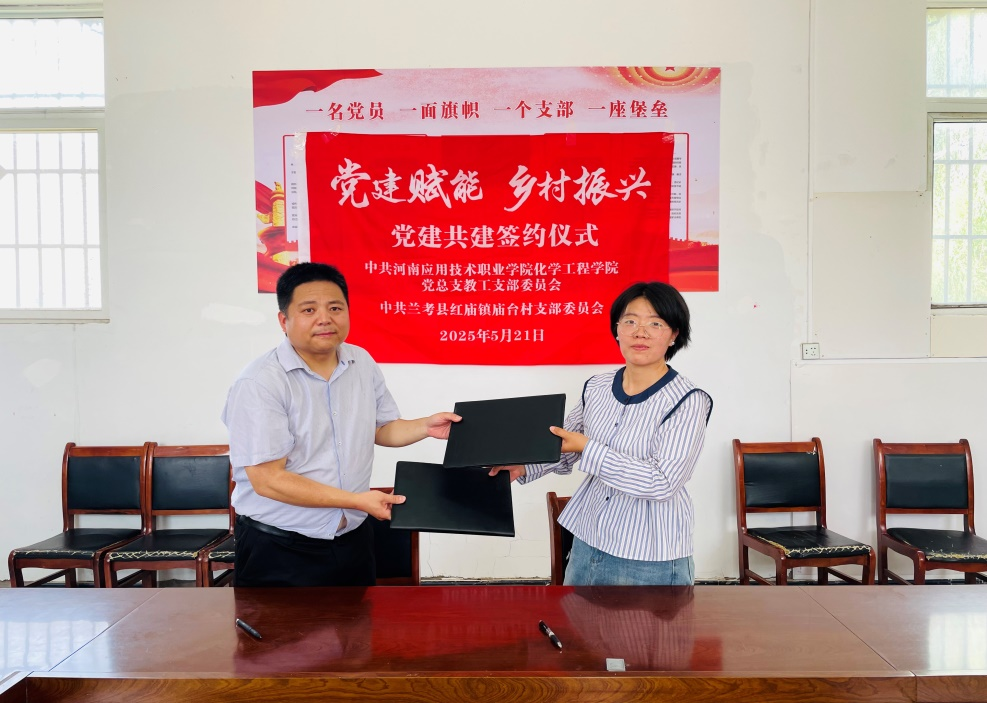 活动结束后,中共星空XK体育党总支教工支部委员会与中共兰考县红庙镇庙台村党支部委员会签订《乡村振兴技术帮扶协议》,推动专业与产业对接、教学过程与生产过程对接,在党建赋能乡村振兴的同时,进一步提升应用化工技术高水平专业群建设。星空XK体育党总支书记陈永惠、党总支副书记常惟诚、副院长岳瑞丰,协管员范雨欣及驻村第一书记任旭凯、队员李盈、陈开友等共同参与签约活动。