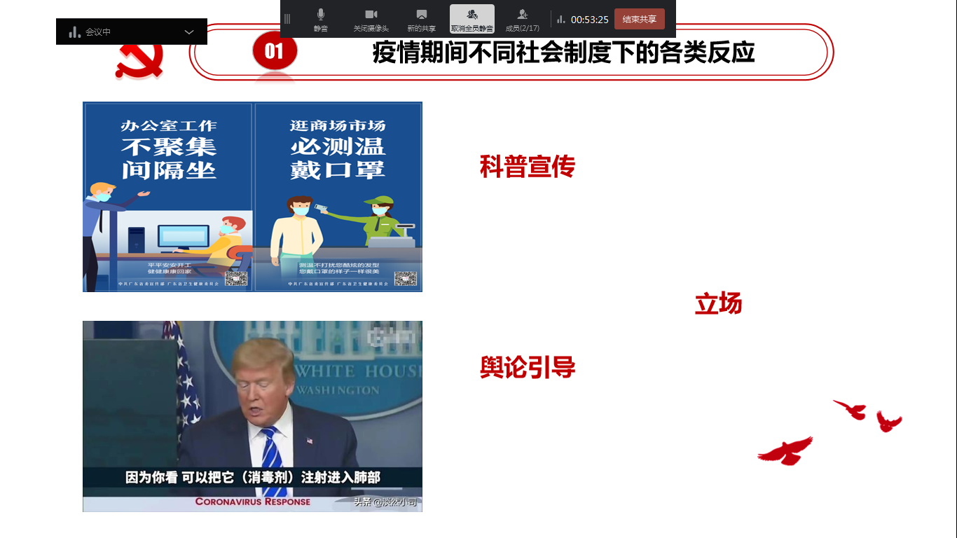 活动从党课教育开始。此次党课以钉钉群方式开始,朱冰同志为大家分享了题目为《从疫情开社会主义制度》的党课。党课中,朱冰同志从各国防疫措施的表现出发,深刻分析了措施背后的制度问题,阐释了中国特色社会主义制度优势,要求全体党员能够增强“四个自信”,以实际行动担当时代使命。