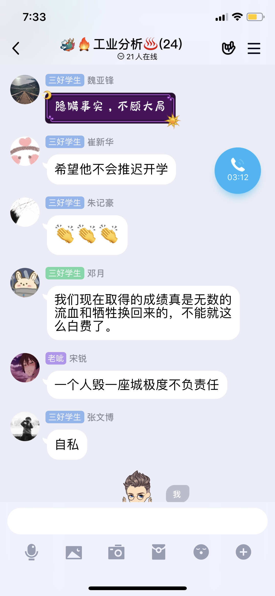 精化1801班李功明同学发言,“在大灾大难面前人人都是参与者,没有人可以做到独善其身。 国内防控工作取得今天这个成果来之不易,外部输入的风险已经来临,我们越是临近胜利越要保持清醒地认知,和正确的行动。虽然黑暗依旧,但是我相信阳光必将再次照射到中华大地之上。”