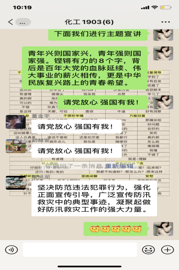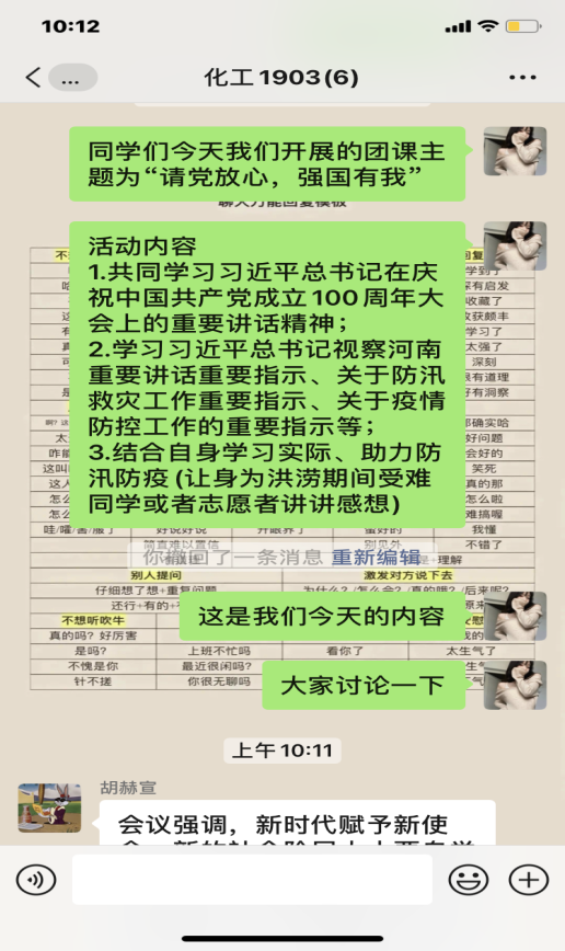 星空XK体育团总支书记刘海龙参加了化工2003班团支部团日活动,他说:新冠肺炎疫情和洪涝灾害的双重肆虐给河南人民带来了严重威胁,但在我党的坚强领导下,上下同心,取得阶段性胜利。暑假期间,星空XK体育的青年学子积极响应政府号召,主动加入到防汛抗洪、疫情防控的志愿者队伍,捐献爱心物资、输送受灾群众、卡点值守等,为抗洪、抗疫阻击战贡献了自己的青春力量。同学们把爱国之情、强国之志化为报国之行,时刻保持时不我待的奋进姿态,增长才干、锤炼意志,用实际行动践行着“请党放心,强国有我”的铿锵誓言,秉持“厚德、精技、励志、笃行”的校训,务实追梦、不负韶华!他勉励青年学生立足身边小事,展现青年担当,力争为民族复兴的中国梦贡献磅礴的青春力量。
