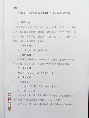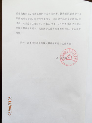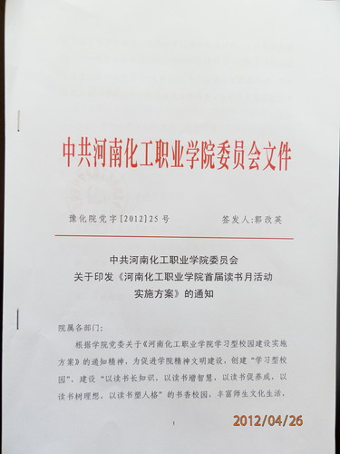化学工程系全体同学: 为丰富同学们课余生活,倡导好读书、读好书,树立良好的学习氛围,建设学习型校园,根据学院安排,我系将组织全体同学参加首届读书月活动,现将活动实施方案转发给大家,请踊跃参加。 化学工程系 2012年4月26日